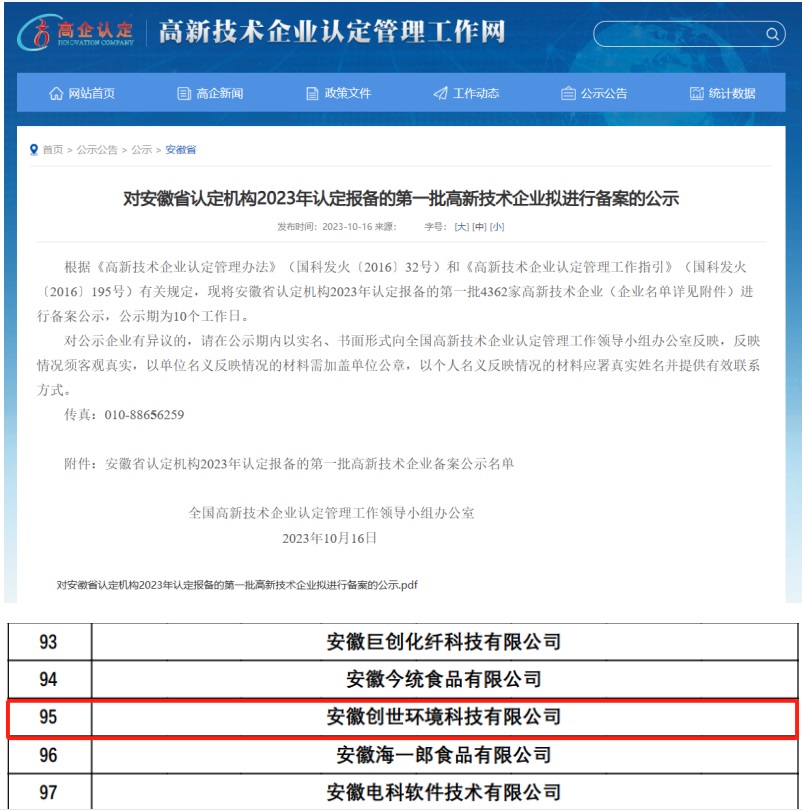 11月7日,全國(guó)高新技術(shù)企業(yè)認(rèn)定管理工作領(lǐng)導(dǎo)小組辦公室發(fā)布了《對(duì)安徽省認(rèn)定機(jī)構(gòu)2023年認(rèn)定報(bào)備的第一批高新技術(shù)企業(yè)進(jìn)行備案的公告》。安徽創(chuàng)世環(huán)境科技有限公司榮列其中,順利通過(guò)國(guó)家“高新技術(shù)企業(yè)”認(rèn)定。這一重大突破標(biāo)志著創(chuàng)世環(huán)境在技術(shù)創(chuàng)新和研發(fā)方面的顯著實(shí)力得到了國(guó)家層面的高度認(rèn)可。
